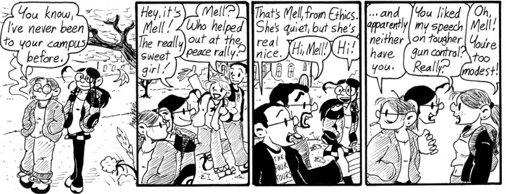 No, I don’t remember what the Four Fours was, besides a classic mathematical puzzle, or why I wished to commemorate it in cartoon T-shirt form. I don’t think Mell’s various admirers are based on anyone in particular. Or maybe they are and I’ve just forgotten. Many details of this strip are strange and mysterious to me now. All I can say with any certainty is that Mell’s skirt is really short in that first panel.