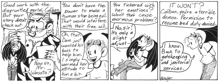 Half-moon reading glasses are a must for anyone with administrative responsibilities. Looking over the top of the glasses at a wayward subordinate is one of the few superpowers available to the combover set. I’m sure Mr. Screwtape keeps a pair in his desk. And Mr. Wasoto is channeling Rupert Giles in the third panel. (“No one takes off his glasses like Tony Head.”)