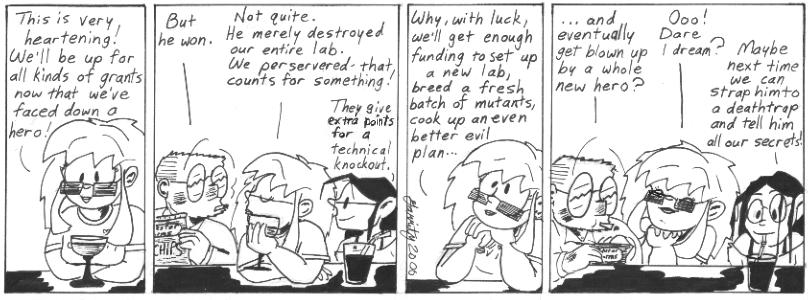 I like the strips that allude to some larger organization apparently in charge of monitoring and encouraging cliche mad-scientist behavior. It’s even better if no real explanation is given for the vague references to grants and stuff. I kind of wish I hadn’t eventually needed to set up concrete institutions like the Mad Science Symposium.
