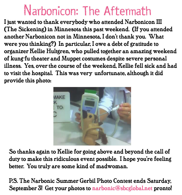 Anyway…I put this post together very quickly at the end of Narbonicon. “The Sickening” ended up being the official title of this one, thanks to the horrible, possibly-engineered-by-mad-scientists bug going around. We had a good time anyway. Events at this one included a trip to the play “Kung-Fu Hamlet” and a tour of the workshop where they make the costumes for “Sesame Street on Ice.” These may seem only tangentially related to Narbonic, but in fact Shakespeare and the Muppets are among the strip’s chief influences.