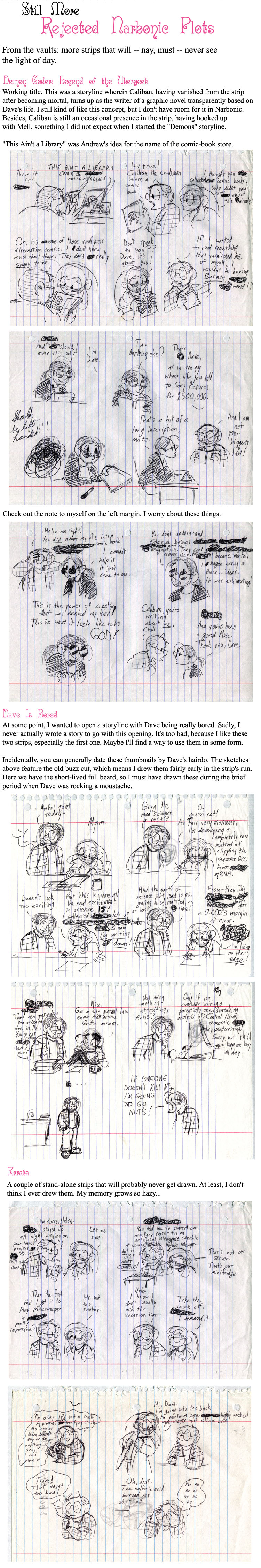 The “Dave gets bored” storyline was originally going to end with Dave going mad, until I decided to make that development more central to Narbonic. Yes, there was a time when Dave going mad was just a subplot. Narbonic went through a lot of drafts.