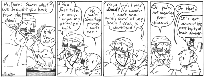 Given that it’s established over the next couple weeks that Dave’s biology really isn’t biologing anymore, I have to wonder what Helen’s listening for in the third panel. Is she checking to make sure his heart isn’t beating?