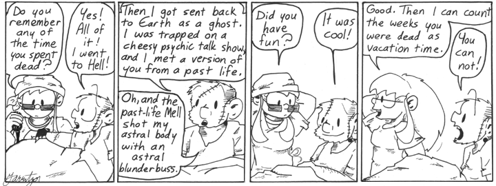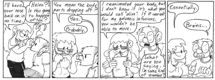 It occurs to me that this is the second undead form taken by Dave, after Ghost. One can only assume that Mummy Dave will appear shortly, complete with glasses worn over a fully bandaged face. (But of course, Narbonic has too many places to go to stick with one trend for that long!)