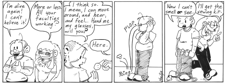 I like that “poing” is apparently the sound of a nose bouncing off the floor of an evil laboratory. Dave looks really freaky without a nose, though. I forgot to draw his facial stitches in the last panel, but they probably just would have made things worse.