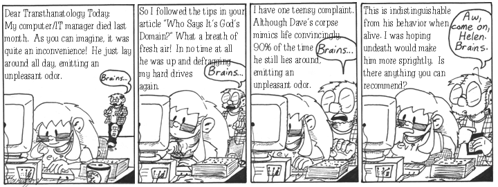 Transthanatology Today is one of several mad-science periodicals mentioned over the course of Narbonic. In the eternally unfinished Narbonic roleplaying game, I wrote that TT is more of a Popular Mechanics-style practical magazine than a serious scientific journal like The New Journal of Malology. It’s full of useful tips for resurrecting the dead in your home or office.