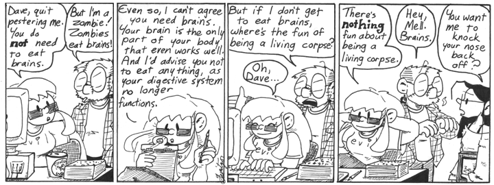 In the first panel … Dave looks like he’s goose-stepping? Well, he hasn’t been a zombie very long, he hasn’t mastered the proper traditional stagger-shuffle yet.