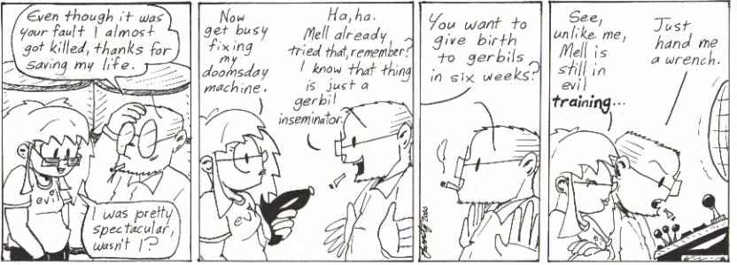 Helen’s confidence that Dave can fix the doomsday device will become a major plot point, oh, four years down the line. To be honest, at this point I didn’t have the larger Narbonic storyline planned, although I knew the strip would run for about five years and I’d already written chunks of some far-off storylines like the time-travel story. I started to work out the main story arc in 2001 and 2002, and by “Island of the Ur-Gerbils,” when Dave repairs the teleporter, it was pretty much set in stone.