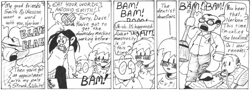 Dr. Noah is named after Noah Singman, a friend of mine from the Mystery Science Theater 3000 Usenet group. Noah continued to read Narbonic and encourage me throughout the strip’s run, even after his namesake’s eventual grim off-panel fate. But that’s a long way off. For now, let’s think happy thoughts about Dr. Noah and his brave refusal to stand for the antics in the evil laboratory upstairs from his dental practice.