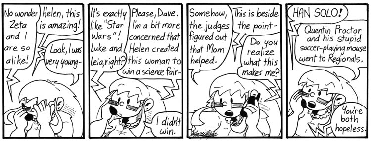 I wrote Dave’s dialogue in a stream-of-consciousness kind of way. This storyline contains a lot of references to random weird experiments Helen presumably conducts off-panel all the time. I think this is my second favorite one.