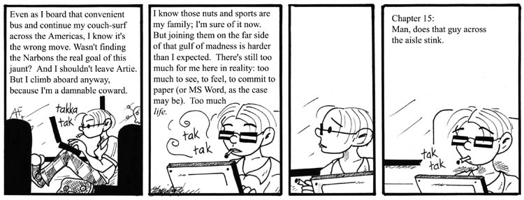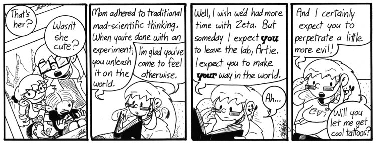 I like to think that all of Artie’s anecdotes are as eloquently phrased as the snippet in the first panel suggests. Artie is definitely the only Narbonic character who would use the phrase “after a pregnant pause” unironically in conversation. Wait, no, Antonio Smith might do that. But probably not, and he’s hardly ever in the strip anyway.