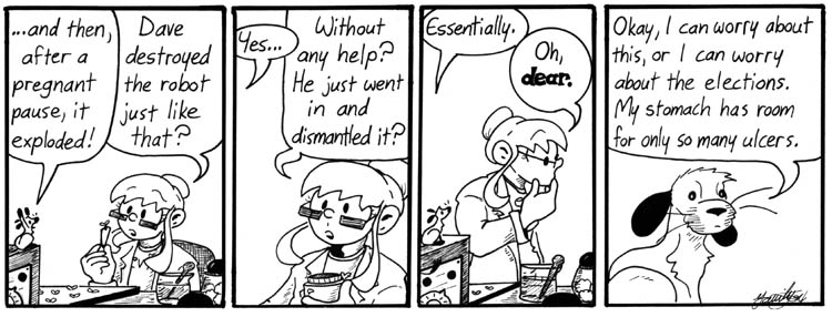 Throughout the strip it’s inferred (and at one point outright stated) that Dave’s influence keeps Helen’s madness and megalomania in check. These strips indicate the kind of horrors that can spring forth from her thinkpan in even a short absence.