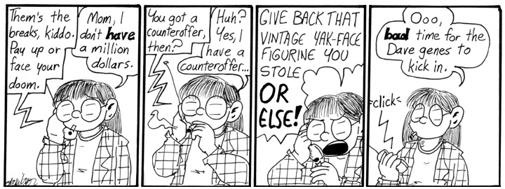 When I first drew these strips, Andrew would look at them and say, “I don’t think you should smoke.” Sorry, Andrew. I like Helen taking a drag on her cigarette before letting fly with the enraged demand for Yak-Face, though. At this point she’s starting to sound like Dave, not just in her passion for vintage “Star Wars” action figures, but in her speech patterns.