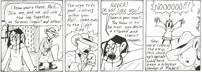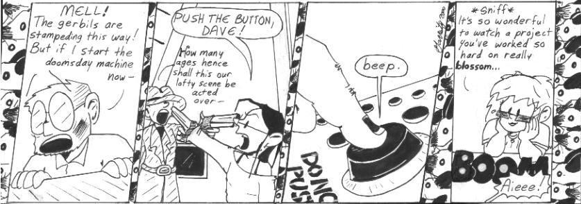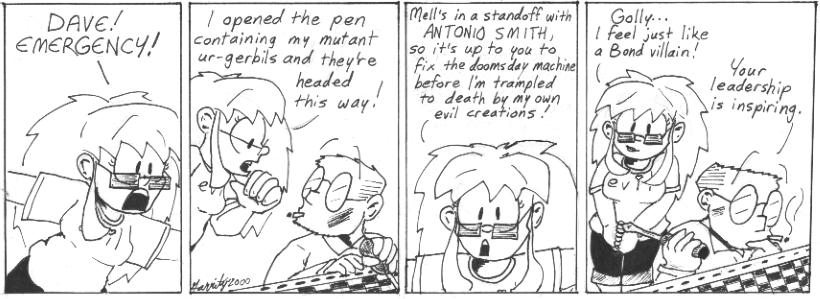 Oh, come on, that gerbil panel is awesome! Six years later, that’s probably still one of my best-looking panels. Sigh. I also like the comically trampled Helen in the last panel. The previous strip had Mell getting bonked on the head, so on the whole this is a big week for violence against women. I made a conscious effort, especially in these early, slapsticky strips, to let the female characters get beat up from time to time. If female characters are considered above pratfalls, they’re just that much less potentially funny.