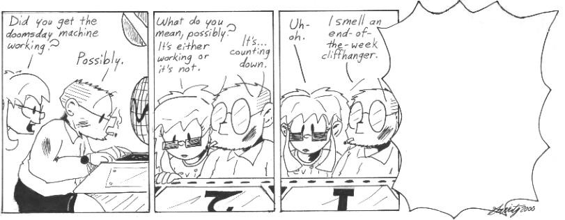 You know, this is the basic plot arc of almost every Narbonic storyline: someone, usually Helen, goes looking for trouble, usually for no good reason, several odd characters and devices are brought into play, they all get set off in various ways, there’s a big explosion, and the survivors go out for drinks. It really never changes much from this first storyline. Creative action plotting: not one of my strong suits. The plots only get more complex later on because I accumulate more metaphorical dominoes to set up. The addition of Artie alone complicates any situation.