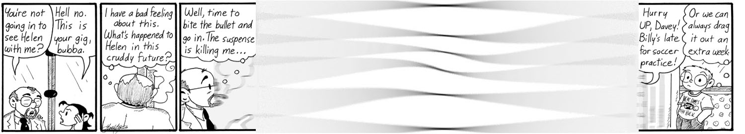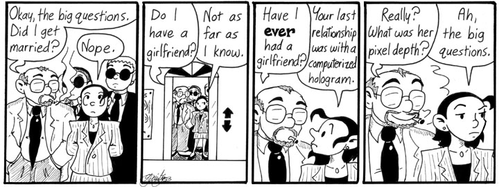 This also echoes the earlier strip where Dave’s high-school buddy wants to know when he’s going to lose his virginity. I’m sorry for repeating the gag, but I like it when characters have dumb questions about the future.