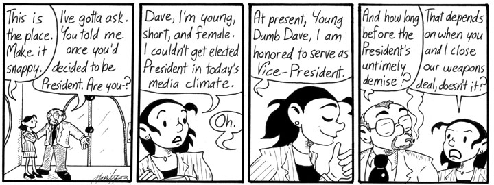 I didn’t go into a lot of detail in the strip, but the concept in the back of my head here was that Mell, an inexperienced but charismatic youngish politician, runs as Vice-President on the Republican ticket (I thought the Republicans would be more successful running a woman than the Democrats, because they could court crossover votes more easily) with a trustworthy old white guy as the presidential candidate. Once they’re elected, she has him quietly assassinated, which doesn’t look suspicious because he’s old and has a weak heart, and takes over the Presidency.
