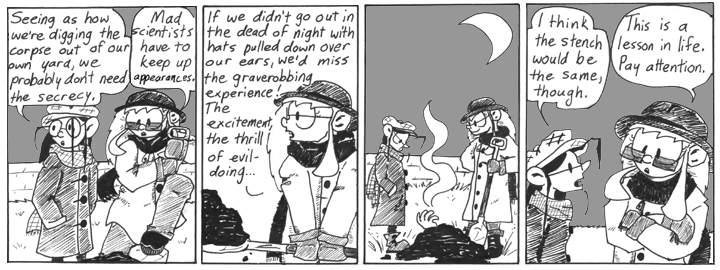 Incidentally, this was still early enough in Narbonic that characters could get away with doing things for little or no logical reason. If this sort of thing came up later in the strip, I’d probably have to devise some strong, plausible reason for Helen to want to bring Dave back to life, but here she just does it because she’s bored and can’t find a good replacement for him.