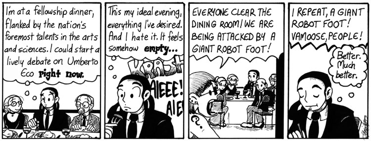 I wrote this one at the last minute and didn’t think it was that great, but Eric Burns did a Websnark post on it, so I figured I must’ve done something right after all. Around this time I was measuring the success of the strip largely by how often I could get Websnark to do a post on it. It was so much more soothing than metrics like popularity or money.