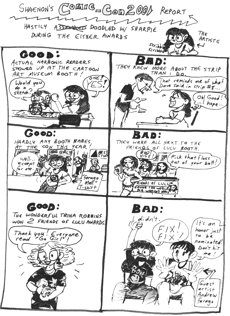 Man, you mean there was a second page of Shaenon’s Comic-Con 2001 Report, all this time? Aaah. Now I have no choice but to doubt everything I know.
