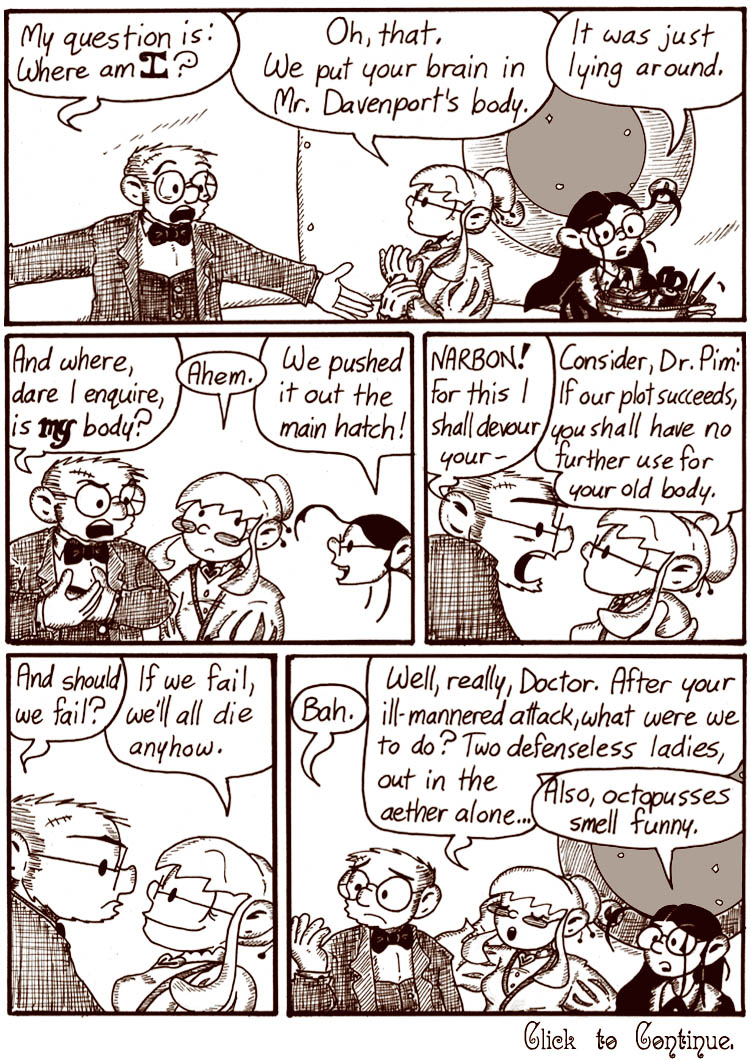 As I’ve said many times before, I mostly made up the Victorian serial as I went along. This plot development seemed like a good idea at the time, plus Dr. Pim as an octopus was kind of hard to draw.