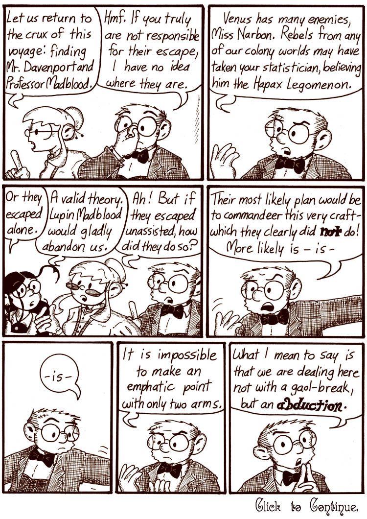 The Victorian serial is about 40% recaps. It’s one of the reasons I’ve been reluctant to put out a print version. (The other main reason is that I’d have to sit down and draw a bunch of Victorian magazine advertisements to fill out the odd-shaped pages, and drawing old-timey stuff is time-consuming.)