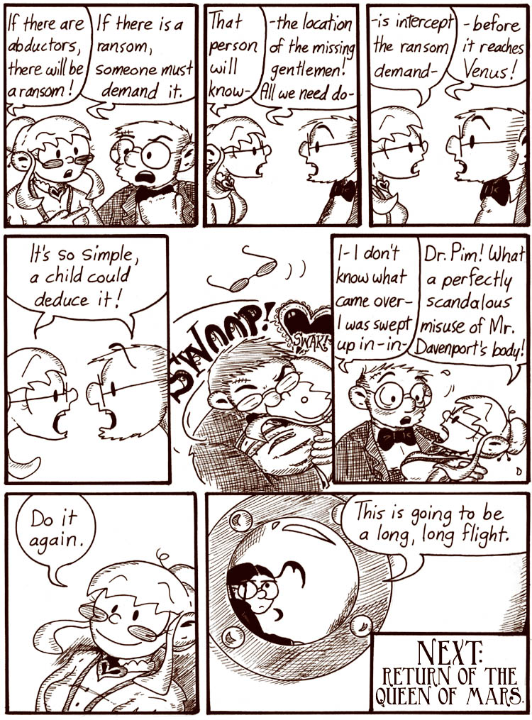 This is one of the longer installments of the Victorian story. Looking back, I can’t believe I had the time to draw this much for a Sunday feature. Even if one of the pages is just a little bathyscaphe thing flying around in sepia-toned space.