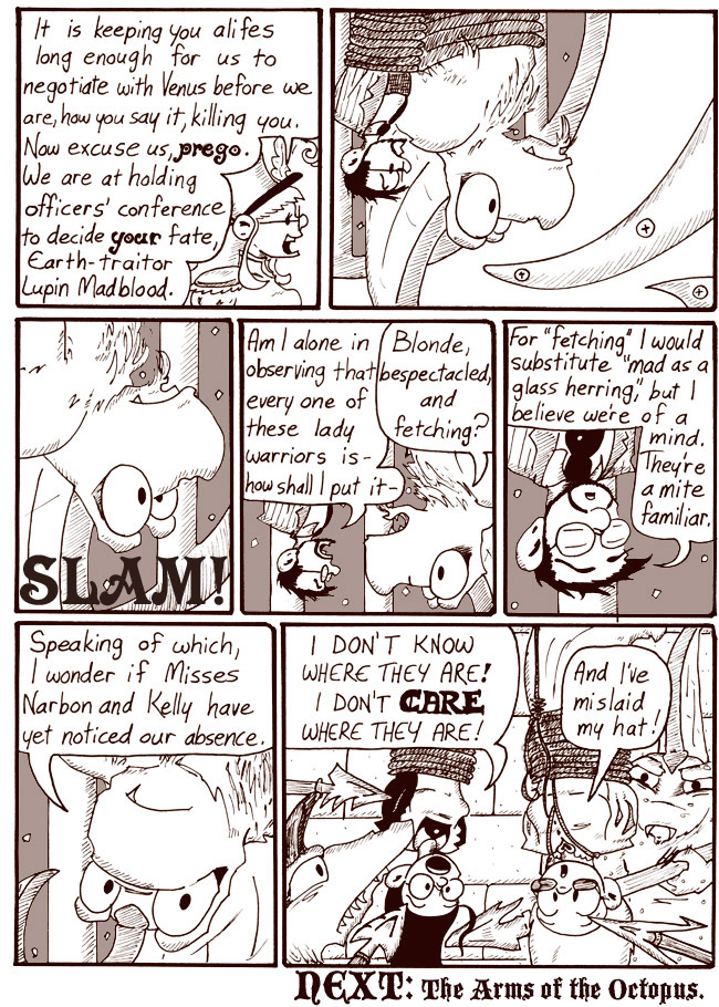 In the last panel, Dave says, “Sergeant–you’re going to kill me at midnight, yes?” Again, Andrew, who is not especially fluent in Italian, did all the translations for the Martians’ dialogue. We apologize for any and all inaccuracies.