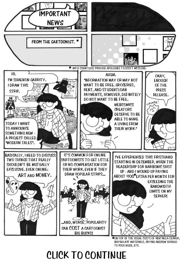 I took Narbonic off Modern Tales in its final months, but that is another story and shall be told another time. I’m now the content editor for MT, and while I’ve been in charge the subscription model has been phased out; it’s now effectively a free site supported (more or less) by advertising, which will have to do until we hit upon something better. Meanwhile, I’ve still got free hosting for my archives. Which was all I signed up for in the first place, so go figure.