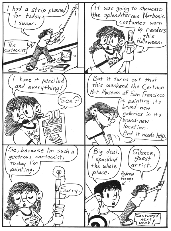 At this point, Andrew had just been hired by the Cartoon Art Museum as its new gallery manager. Like, that week. The museum was moving from its previous location on the second floor of a building on Mission Street to a beautiful new gallery space a few blocks away, in the museum-heavy South of Market area, where it resides to this day. The new space had previously been occupied by the Ansel Adams Gallery, which spent a lot of money carefully renovating and updating the galleries and then went out of business. Photography’s loss is cartooning’s gain; the Cartoon Art Museum inherited a great set of galleries that just needed a paint job, as depicted here.