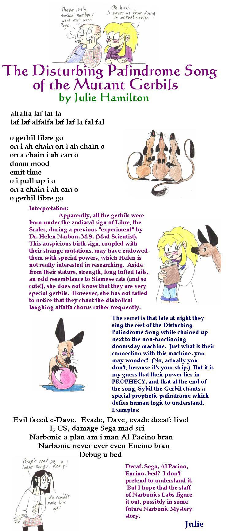 Julie Hamilton is a college friend. She’s kind of a mad genius herself. She wrote both the song and the commentary here. I later used this song as the inspiration for giving all the ur-gerbils palindromic names.