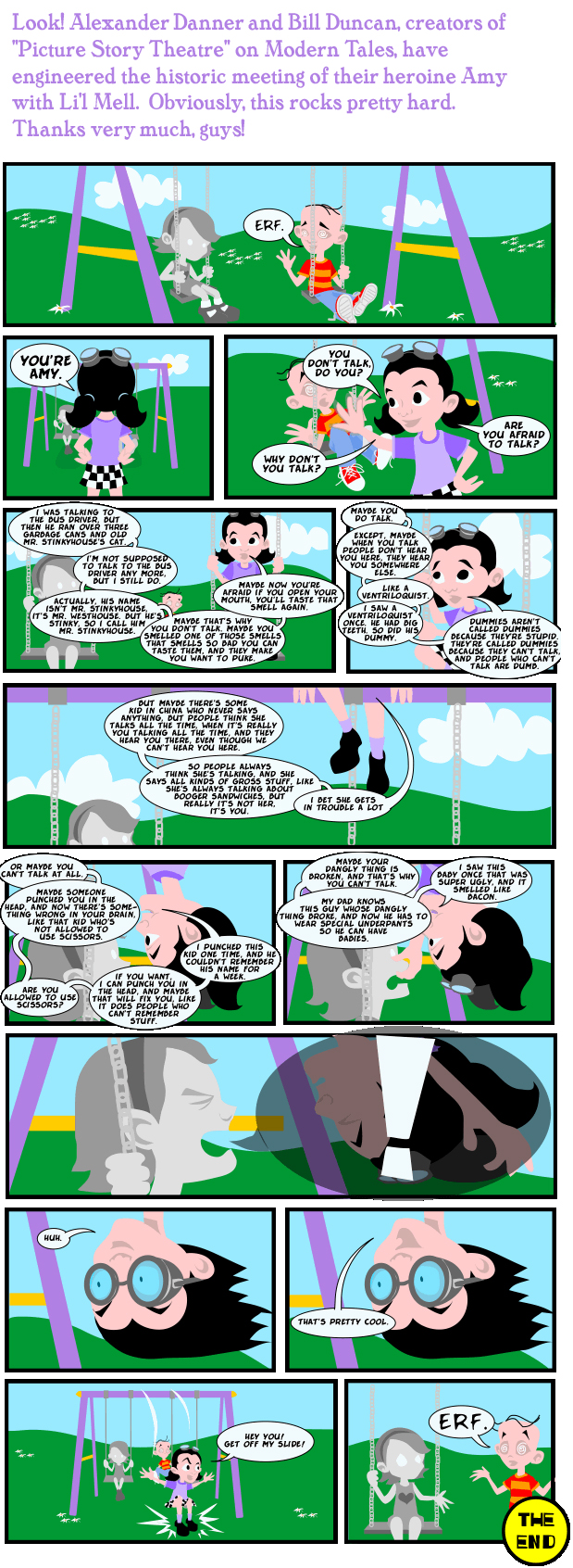 Aw… I’m very fond of this one. Not many people outside of the Girlamatic gang have done Li’l Mell art. Alexander Danner is still doing great, thought-provoking comics at his site, although I don’t think he’s done an Amy story in a while, which is too bad. He and Bill Duncan do the excellent Picture Story Theatre over on Modern Tales.