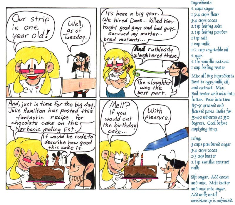 Julie Hamilton, previously notable for penning the Disturbing Palindrome Song of the Mutant Gerbils, is a college friend, and she originally got this cake recipe from our circle of college friends (specifically, I believe, through our friend Mike McGuire). It was popularly known, for obscure reasons, as Stand Up and Fuck Cake, hence Artie’s comment in the third panel. It’s a tasty cake.