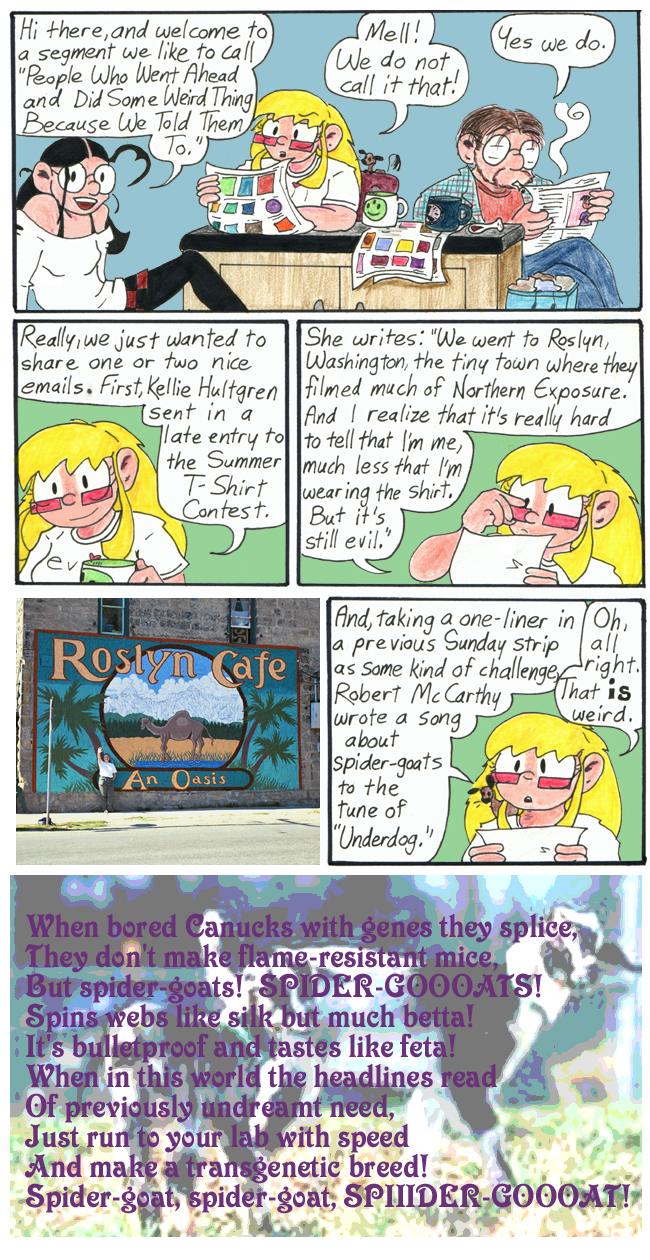 Kellie Hultgren later organized the Narbonicons, which started in 2003. Rob McCarthy is a friend and Viz coworker as well as the creator of the comic Hell on Wheels. His spider-goat song still cracks me up. All spider-goat songs should mention feta cheese, one of the funniest cheeses.
