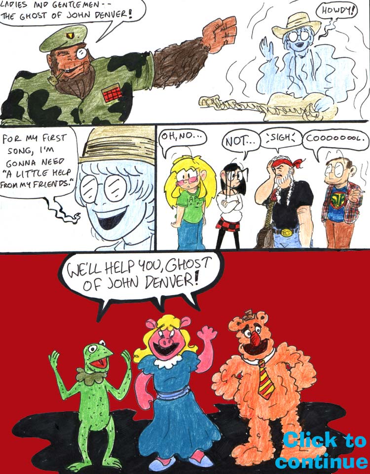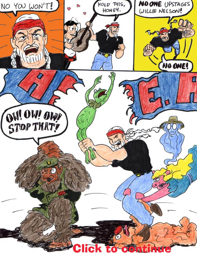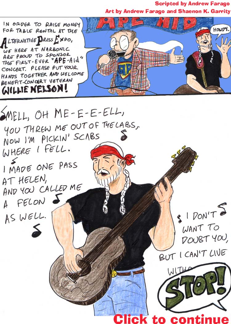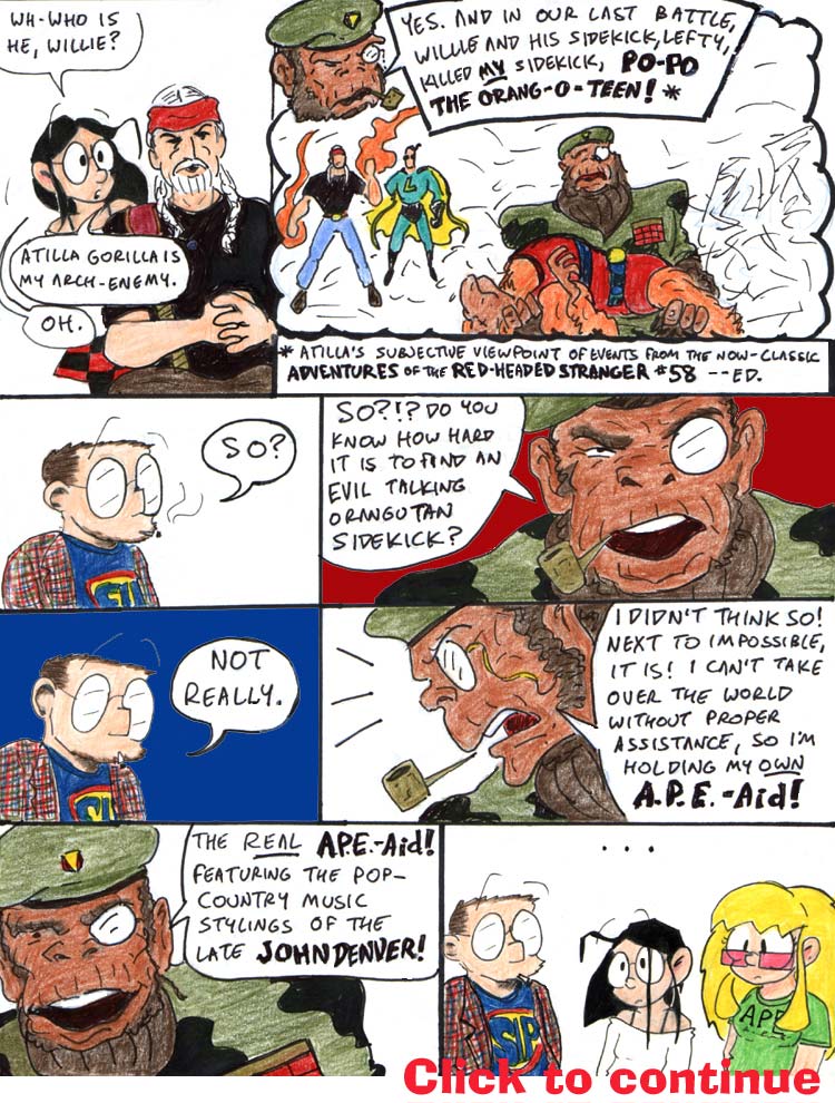 I love the flames coming off Willie Nelson’s fist in the second panel. Andrew’s got a knack for Drawing Comics the Marvel Way. He also came up with all the awesome ape names.