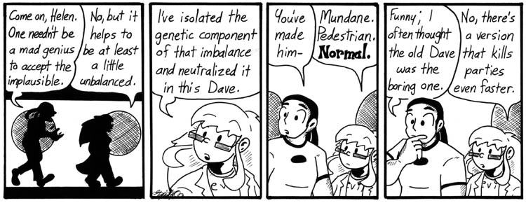 Helen’s statement in panel 2 is an interesting and pessimistic observation about a mad scientist’s world. If the world of Narbonic is fundamentally chaotic, then a sane scientist is ultimately powerless to control it. Only a mad scientist, through irrational and insane observations and realisations, can fully comprehend and master the world.