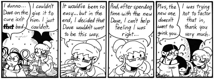 I can’t remember when I came up with the particular plot point of Helen being madder before Dave came along, but these strips were fun to write. I like Mell being nostalgic for Extra Crazy Helen. It once again brings up the unanswered question of where the heck Mell came from. Apparently one day she just showed up at the lab and started helping Helen out with the mayhem. Of course in the Li’l Mell spinoff she’s always been like this.