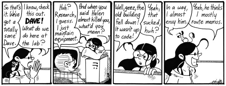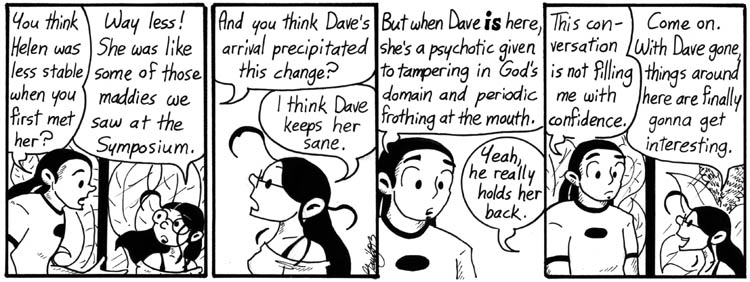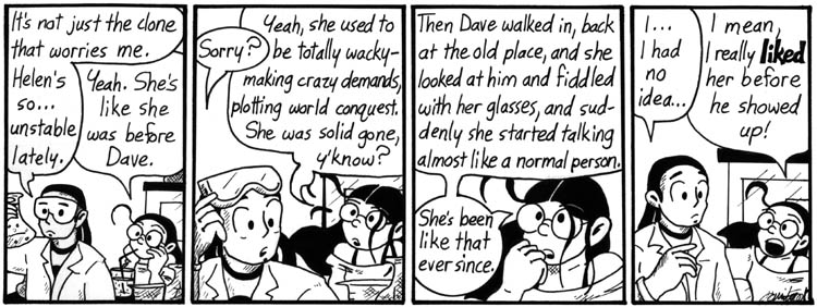 I always kind of wanted to draw the scene Mell describes, maybe as a bonus story in one of the books. But I couldn’t make it funny, so I never did. It’s probably more dramatic as told secondhand, anyway. It’s kind of retcon-y, but it does help explain why Helen, and Narbonic in general, were wackier in the early strips.