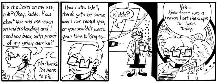 But when <SPOILERS> Mell and Artie find the VCR with all those old tapes of Beta and what-not, there’s no indication of them taking out a tape that’s already in the machine or disrupting Dr. Narbon’s taping of General Hospital. Does such an event transpire without acknowledgment in the comic? Does the lair have more than one TV/VCR setup? Is Dr. Narbon’s memory faulty, and she didn’t set the soaps to tape after all? For the luvva Mike WHAT HAPPENED TO THE TAPING OF GENERAL HOSPITAL? </SPOILERS>