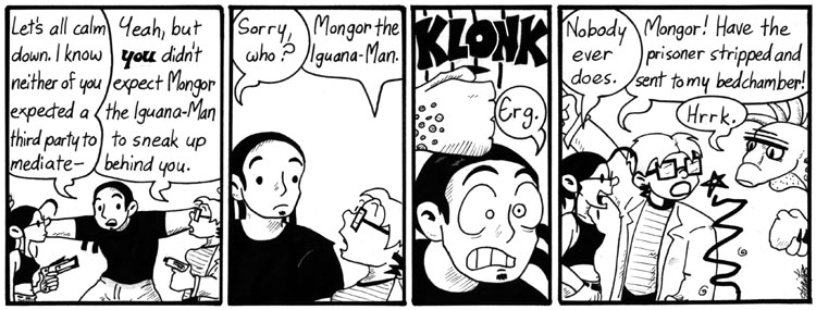 As I’ve said before, the basic concept for this storyline is extremely old, but it took a long time for it to come together. It was like the “Doppelganger Gambit” storyline: I drew a handful of strips, couldn’t figure out a plot for them, and set them aside. With “Doppelganger Gambit,” everything suddenly came together when I had the idea of setting the story on the Moon. With this storyline, it came together when I thought of Mongor the Iguana-Man. I don’t know why or how this worked, but Mongor is the magic glue in “Battle for the Lost Diamond Mines of Brazil.”