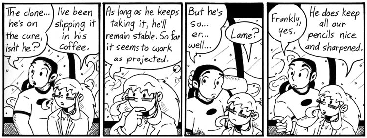 I’d prefer being the mad, evil genius, myself. I have a lot of uses for a death ray. I’m pretty sure we don’t see all of the side effects that Ed lists. Perhaps they will appear in Narbonic 2.0.