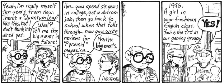 I dunno, I always liked this strip. We really see how much Majel still means to him, in that he imagines scoring with her will make him over into the person he’s always wanted to be. Which ultimately makes his interaction via email with her at the end of the story mean more in terms of his character development.