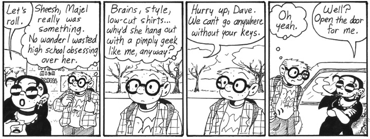 I mention this in a later Sunday feature, but earlier drafts of this storyline included two fairly long sequences in Dave’s high-school life that I cut. One involved Dave’s first encounter with the Dave Conspiracy and explained how he was recruited into that organization (besides being named Dave). The other had Dave calling the teenage Helen for help. I liked a lot of things about the latter idea, including that it gave me a chance to draw pimply teenage Helen, but in the end I dropped it, mainly because I couldn’t figure out how Dave would get Helen’s high-school-era phone number.