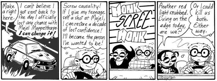 If I understand the Narbonic time model (which I freely admit that I don’t), Dave getting his past self killed here would create a timeline in which he died at 16, and thus never went to work for Narbonics Labs, and thus never became unstuck in time and accidentally killed his past self. His failure to go back in time and kill himself would then create a timeline in which he lived to be hired by Helen and sent back in time, where he’d kill himself, thus creating a timeline in which he died at 16 and was never hired by Helen and so didn’t go back in time and so on.