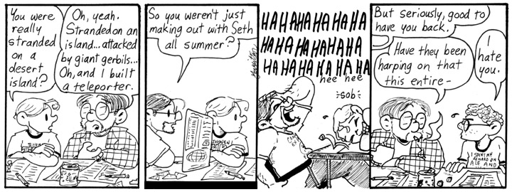 Andrew totally inked the first three strips this week. I’d recognize his style anywhere. I don’t know why we did this, and neither of us can remember doing it.