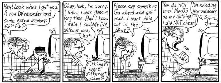 Early on, I wrote several strips involving Dave’s relationship with his computer. This was the only one I found a place for. It’s a generic gag that can be tweaked to fit any number of storylines.
