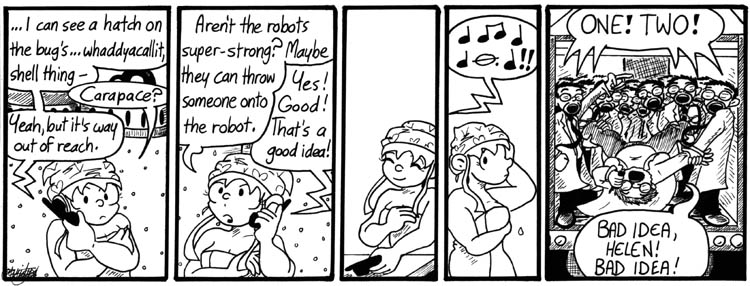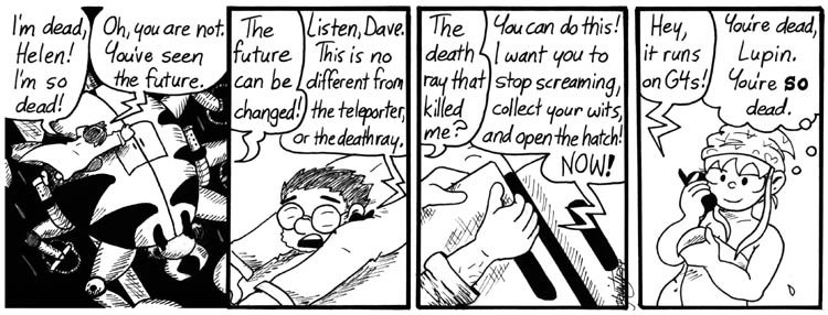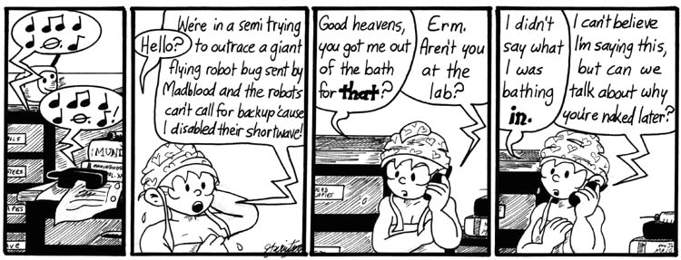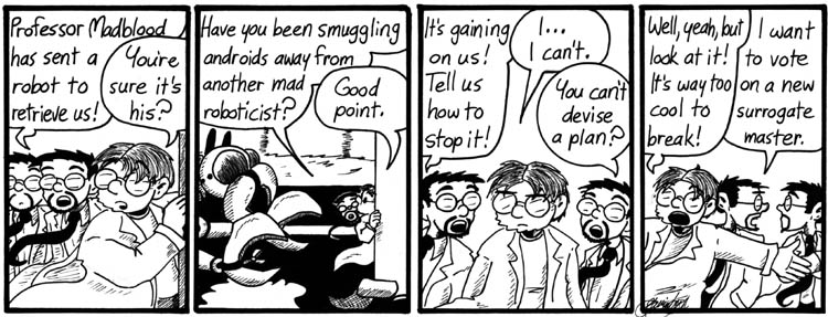 I mostly made this storyline up as I went along by knotting together loose ends from previous storylines: Zeta, the Madblood androids, the hamsters, Dave’s brother. Given that, I’m surprised by how well it turned out. I still really like this storyline, mainly because of strips like this one.