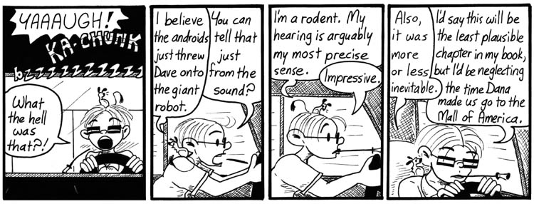 It always bothers me that Dave’s head is too big in the third panel, because everything else about this strip is perfect and awesome. It’s so worth setting up all the other stuff so I can get to the point where the giant robot big chases the semi full of rogue androids.