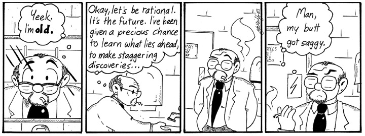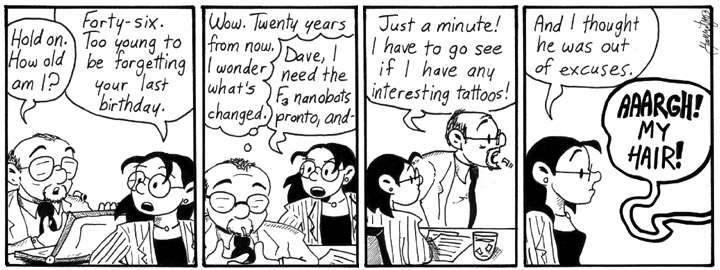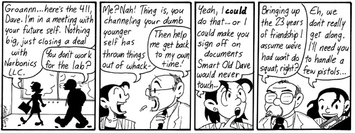 Panel 4 is one of my favorites in the whole run of Narbonic. So much so that I chose to duplicate it for one of the pictures when I dressed up as Old Dave for Halloween a couple years back. I think that picture’s in the Skin Horse Archive somewhere, on one of the Sundays.
