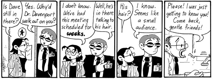 This strip was written so long ago that, in the thumbnail, Dave still had his close-cropped haircut from the early years of the strip. Originally his line in the last panel was, “I’m sorry I cut you brutally short!”