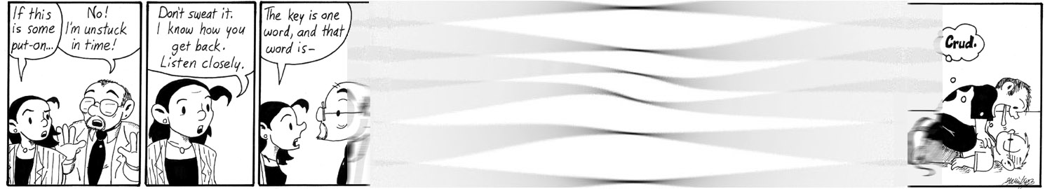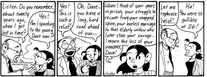 I hate it when characters hide some amazing and/or wacky truth about themselves for no particular reason (the “can’t let the neighbors know” phenomenon), so in this storyline Dave tells just about everyone he meets that he’s traveling through time. Some people believe him, some don’t, and some, like Mell, take advantage of the situation to mess with his head.